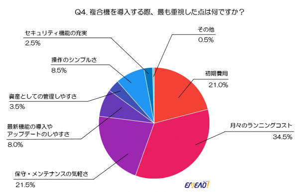 複合機を導入する際に最も重視された点は「月々のランニングコスト」で、34.5%が選択しています。次いで「保守・メンテナンスの手軽さ」が21.5%、「初期費用」が21%と続いています。