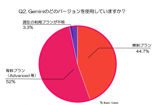 Geminiの利用プランについて、有料プランが52%の支持を集め、最も多く利用されていることがわかりました。