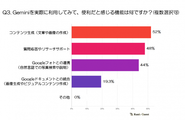 Geminiの中で最も便利だと感じられている機能は「コンテンツ生成(文章や画像の作成)」で、全体の52%を占めています。