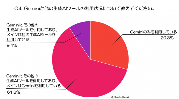 次いで、「Geminiのみを利用している」が29.3%、「Geminiとその他の生成AIツールを併用しており、メインは他の生成AIツールを利用している」が9.4%となっています。