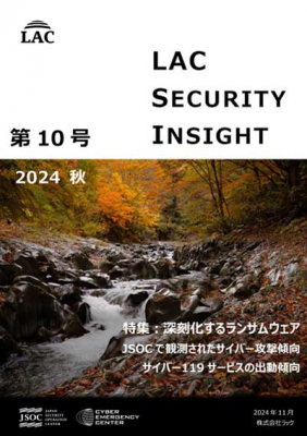 株式会社ラック(本社:東京都千代田区、代表取締役社長:西本 逸郎、以下 ラック)は、サイバー攻撃の脅威に最前線で対応している"セキュリティ監視センターJSOC"、サイバー被害を受けた組織を救済している"サイバー救急センター"、攻撃者のサイバー攻撃手法も採り入れてお客様のシステムへ疑似侵入テストを行う"デジタルペンテスト部"などのセキュリティ専門家が、分析・調査・侵入テストを実施する中で得た最近の脅威の傾向や特徴を「洞察」としてまとめた「LAC Security Insight 第10号 2024 秋」を2024年11月25日に公開しました。