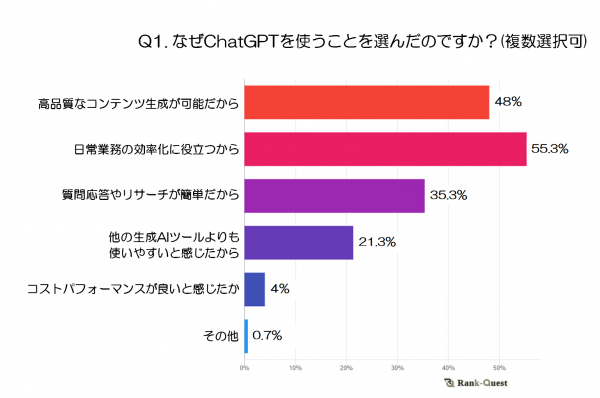 ChatGPTを選んだ理由として最も多かったのは「日常業務の効率化に役立つから」で、全体の55.3%を占めています。次いで、「高品質なコンテンツ生成が可能だから」が48%、「質問応答やリサーチが簡単だから」が35.3%となっています。