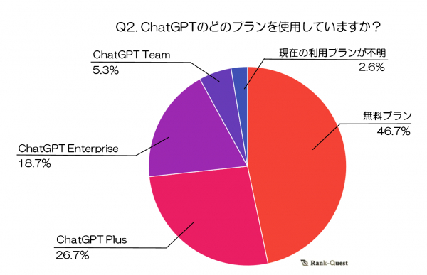 この結果から、多くのユーザーが無料プランでChatGPTを利用している一方で、有料プランであるPlusやEnterpriseも一定の支持を得ていることがわかります。