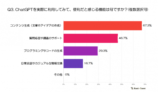 ChatGPTの便利だと感じる機能で最も多かったのは「コンテンツ生成(文章やアイデアの作成)」で、全体の67.3%を占めました。次いで、「質問応答や調査のサポート」が46.7%、「プログラミングやコードの生成」が29.3%となっています。「日常会話やカジュアルな情報交換」は16.7%と比較的少ない割合でした。