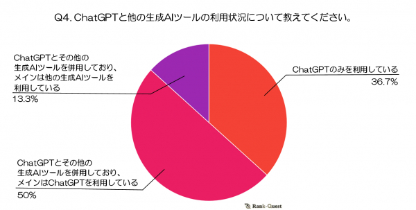 ChatGPTの利用状況に関して最も多かった回答は、「ChatGPTとその他の生成AIツールを併用しており、メインはChatGPTを利用している」で、全体の50%を占めています。次いで、「ChatGPTのみを利用している」が36.7%、「ChatGPTとその他の生成AIツールを併用しており、メインは他の生成AIツールを利用している」が13.3%となっています。