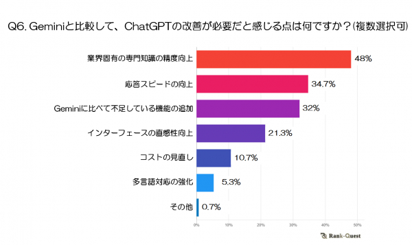 Geminiと比較してChatGPTに改善が必要だと感じる点として最も多かったのは、「業界固有の専門知識の精度向上」で、全体の48%を占めています。次いで、「応答スピードの向上」が34.7%、「Geminiに比べて不足している機能の追加」が32%となっています。