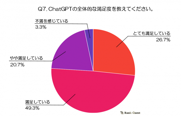 ChatGPTの全体的な満足度について「満足している」と回答した方が最も多く、全体の49.3%を占めています。次いで、「とても満足している」が26.7%、「やや満足している」が20.7%となりました。一方、「不満を感じている」は3.3%、「非常に不満を感じている」という回答はありませんでした。