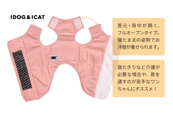 シニア期や病中で寝たきり状態のペットにも着せやすいお洋服です。