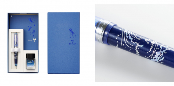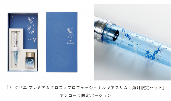 プラスとセーラー万年筆が共同運営している万年筆・文房具ギフトショップ「ancora(アンコーラ)」(https://www.ancora-shop.jp)では、アンコーラ限定バージョンの「海月セット」を数量限定で同時発売します。メーカー希望小売価格(税込)は、38,500円です。