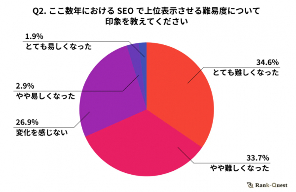 SEOの取り組みがより広く一般化されたことや、AIの登場でコンテンツの制作速度が飛躍的に上がったことで、上位表示が難しくなったと感じている人が多くなっているようです。