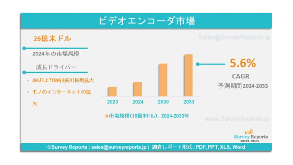 グローバルビデオエンコーダー市場は、2024年から2033年の期間にわたって年平均成長率5.6%で成長し、2033年までに46億米ドルの収益を上げる見込みである。