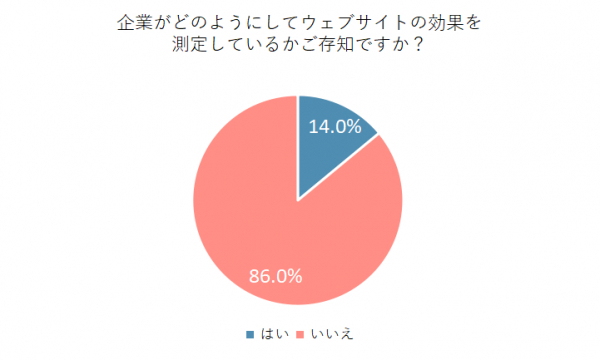 企業がどのようにしてウェブサイトの効果を測定しているかご存じですか?」という質問に対し、「はい」と回答した人は全体の14%にとどまり、「いいえ」が86%を占める結果となりました。ウェブサイト効果測定は、専門的な知識やツールを必要とするというイメージが強く、一般の人にとっては身近なものではないという認識があるのかもしれません。
