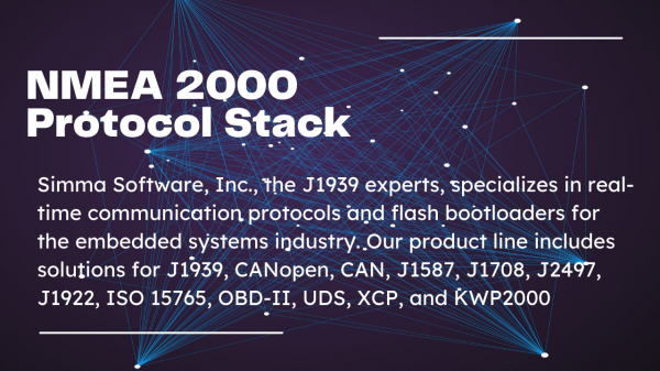 NMEA 2000プロトコルスタックを提供いたします。本ソフトウェアは、米国でCAN(Controller Area Network)の専門家として広く認知されているSimma Softwareによって設計され、高速なCAN通信の厳しい要求に応えるために開発されました。