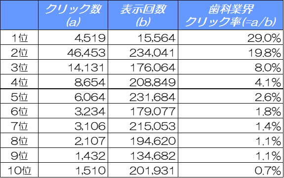 SEO支援実績4,300社を誇るランクエスト(https://rank-quest.jp/column/column/subcontracting-request/ )は、歯科クライアントのサイトデータをもとに検索順位別のクリック率(CTR)を計測しました。