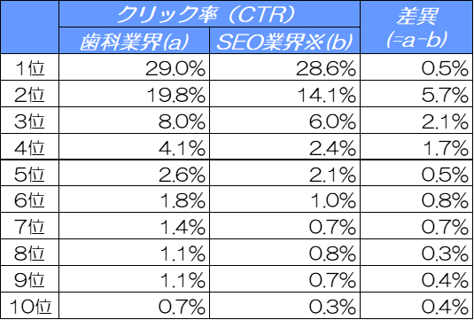 この比較データから、歯科業界の検索結果は、SEO業界と比べて同じ順位でもクリック率(CTR)が全体的に高めであることがわかります。