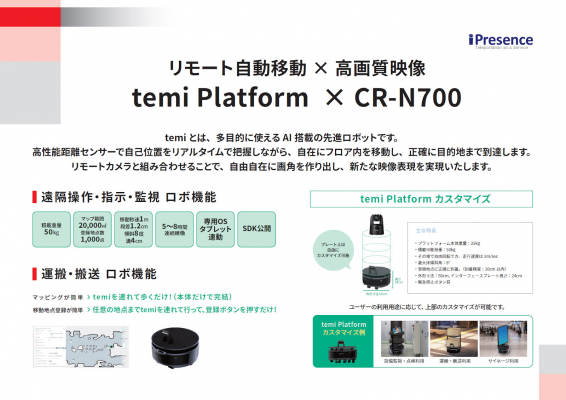 iPresenceは、自律移動ロボット「temi Platform」にキヤノンの高性能リモートカメラ「CR-N700」を搭載し、ケーブルレスでリモートコントロールが可能な新しいソリューションを考案しました。この革新的な技術は、2024年11月13日〜15日に開催された、音と映像と通信のプロフェッショナルが集まる「Inter BEE 2024/幕張メッセ」で初めて展示され、多くの来場者から注目を集めました。
