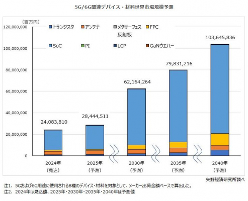 【矢野経済研究所プレスリリース】5G/6G関連デバイス・材料世界市場に関する調査を実施(2024年)〜2024年の5G/6G関連デバイス・材料世界市場規模(8種計)は24兆838億円の見込〜