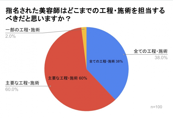 「指名された美容師はどこまでの工程・施術を担当するべきだと思いますか?」のアンケート調査を行ったところ、『全ての工程・施術』が38%、『主要な工程・施術』が60%となり、最初から最後までの全ての施術を担当してほしいと考える人が約4割という結果となりました。
