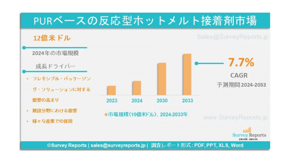 Survey Reports LLCは、2024年12月にPUR系反応型ホットメルト接着剤市場の調査レポートを発行したと発表した。同レポートでは、タイプ別(非反応型および反応型)、用途別(紙、板紙、包装、ヘルスケア、自動車、 家具、履物、繊維、電気・電子、製本、その他用途) - グローバル市場分析、動向、機会、予測、2024年から2033年」を発行した。PUR系反応型ホットメルト接着剤市場の予測評価を提供するこのレポートは、PUR系反応型ホットメルト接着剤市場の成長促進要因、市場機会、課題、脅威など、いくつかの重要な市場力学に焦点を当てている。
