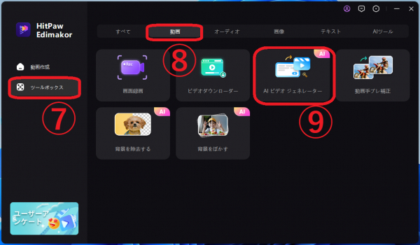 スクリプトをコピーし、一旦ウィンドウを閉じます。次にホーム画面から「ツールボックス」>「動画」>「AI動画ジェネレーター」を起動。
