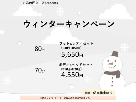 【立川店 リラクゼーションマッサージ】もみの匠立川店〜ウィンターキャンペーン〜