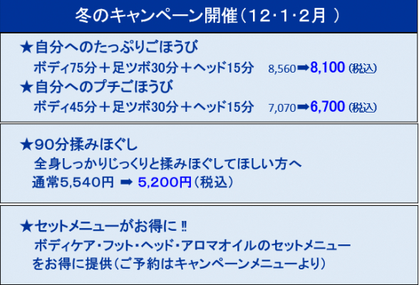 冬のキャンペーンは、ボディ+足ツボ+ヘッドのセットや90分の揉みほぐしなど様々なメニューがお得に受けられます!