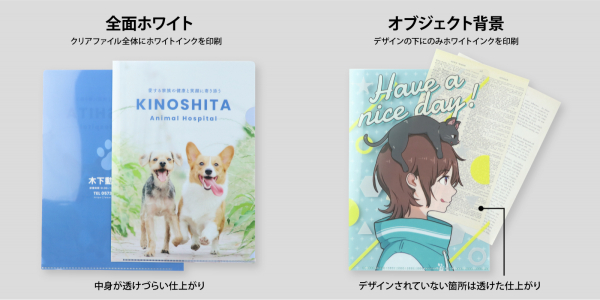 クリアファイルは、透明素材に印刷するため、透け防止でホワイトインクを推奨しています。ホワイトインクが含まれた料金のため、追加料金はありません。