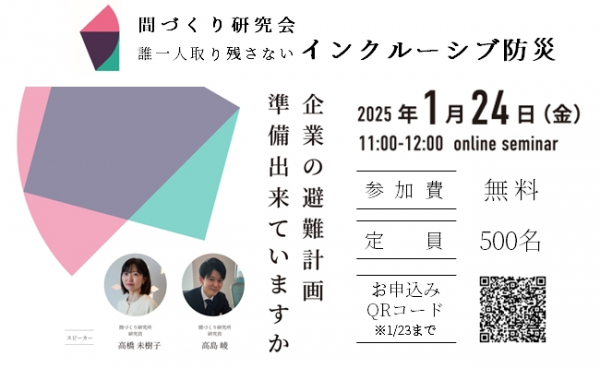 能登半島地震での高齢者や障害者の避難の実態や、避難に困難を抱える従業員への対応に関する調査結果、当社の避難計画についても触れながら、誰一人取り残さない「インクルーシブ防災」について考えていきます。