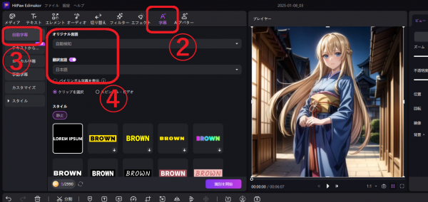 メニューから「字幕」>「自動字幕」と進み、言語を指定します。例えば動画を日本語に翻訳するなら、オリジナル言語は「自動検知」、翻訳言語は「日本語」と設定します。