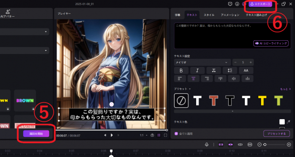 設定できたら「識別を開始」をクリック。AIが音声認識を行いながら字幕を生成していきます。完了したらプレビュー画面でチェックし、問題がなければ「エクスポート」から保存して終了です。フォントやサイズ、色などの変更も手軽に実行できます。