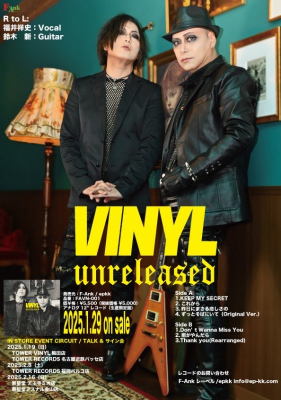 epkk合同会社(東京都新宿区・代表社員 北村和孝)は、ロックユニット「VINYL (ヴィニイル)」ボーカリスト福井祥史、ギタリスト鈴木新)の未発表曲を収録したアナログ盤レコード「unreleased」を全国発売(1月29日)します。発売を記念して2月11日(火)には「佐藤あつしのワイルドで行こう」にギタリスト鈴木新がゲスト出演します。