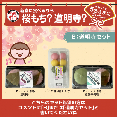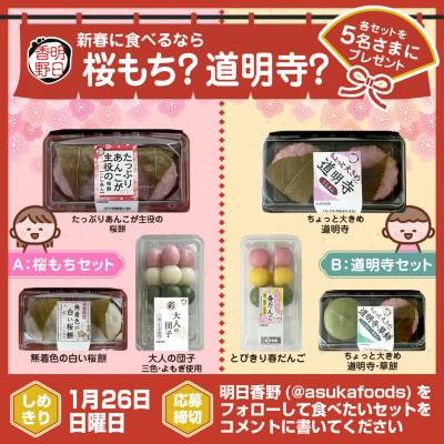 (2)キャンペーン期間中に「新春に食べるなら 桜もち?道明寺?」キャンペーンの投稿を「A.桜もちセット」希望の場合はリポスト。「B.道明寺セット」希望の場合はいいね。
