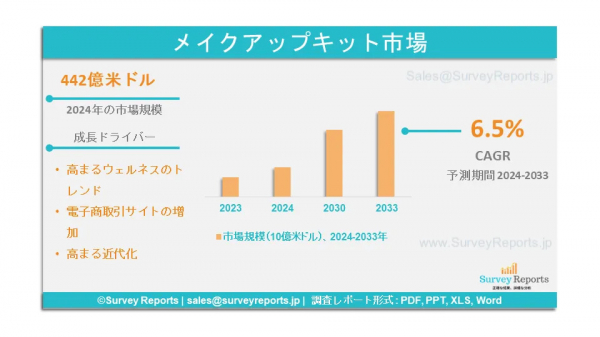 Surveyreportsの専門家は、メイクアップキット市場の調査を分析し、メイクアップキット市場規模は2024年に442億米ドルに達すると予測した。さらに、メイクアップキット市場のシェアは、2033年末までに728億米ドルの収益を達成すると予測されている。メイクアップキット市場は、2024年から2033年の予測期間中に、年間平均成長率(CAGR)約6.5%で成長すると予測されている。