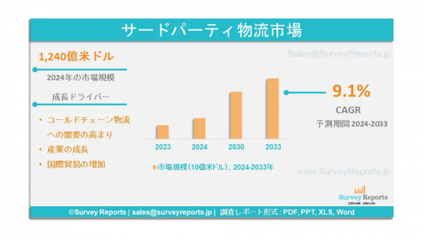 Survey Reports LLCは、2025年1月に、輸送手段(鉄道、航空、道路、海路)によるサードパーティロジスティクス市場のセグメンテーション、サービスタイプ(専用契約輸送(DCC)、国内輸送管理 、国際輸送管理、付加価値倉庫・配送)別、産業別(テクノロジー、自動車、小売、製造、物流) - 2024年から2033年までの世界市場分析、動向、機会、予測を提供する。サードパーティロジスティクス市場の成長要因、市場機会、課題、脅威など、サードパーティロジスティクス市場におけるいくつかの重要な市場力学を強調している。
