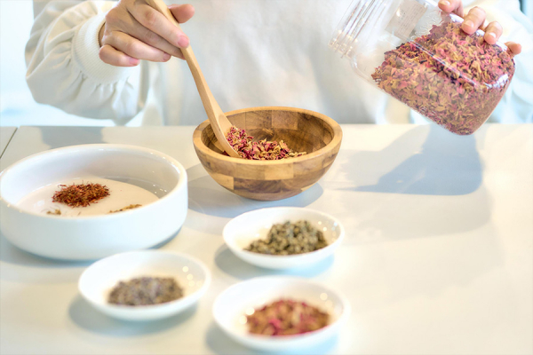 温浴やハーブのプロフェッショナルである星山千穂さん(日本温浴研究所)より薬草・ハーブの種類や効能などレクチャーいただきます。10種類以上のハーブや花の中から好きなものをお選びいただき、オリジナルの入浴剤を作成します。
