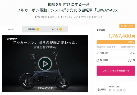 フルカーボン電動アシスト自転車「ERWAY-A06」が公開後12時間で目標金額達成!