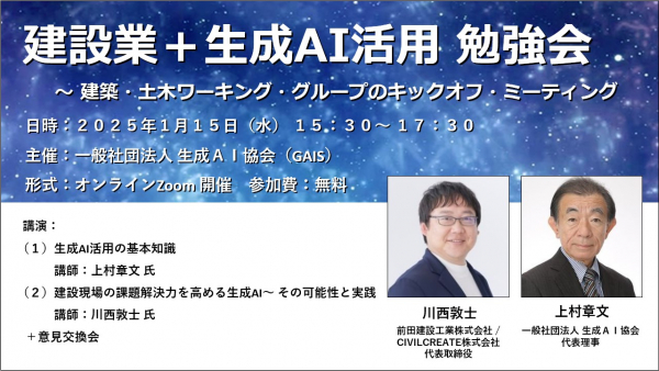 2025年1月15日(水) の15:30から一般社団法人 生成AI協会(GAIS)が主催する「建設業+生成AI活用 勉強会 〜 建築・土木ワーキング・グループのキックオフ・ミーティング」がオンラインで開催され、セミナー終了後は、活発な意見交換が行われました。