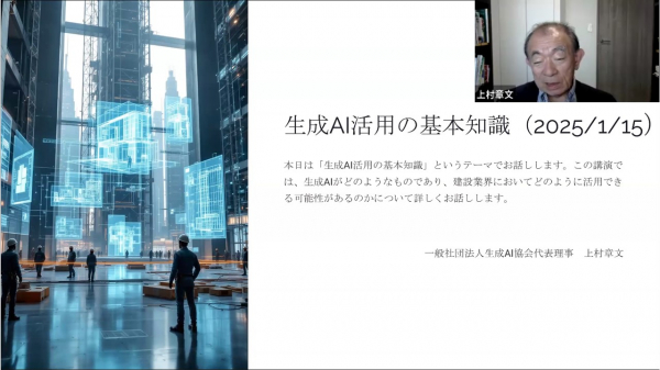 一般社団法人生成AI協会の上村章文代表理事が、生成AIの基礎知識と建設・土木業界での活用方法について講演を行いました。生成AIは文章や画像、動画を新たに創造する技術で、従来のAIとは異なり、ゼロからデータを生成できる点が特徴と説明。講演では、生成AIが業務効率化だけでなく、創造的なプロセスを支援する重要な技術であると解説しました。建設・土木業での具体的な活用例として、建設計画書や工程表の自動作成、現場報告書の迅速な生成、施工段階のシミュレーション動画や建物完成予想図の作成が紹介されました。また、リスク管理や安全計画の策定、設計データの最適化といった高度な業務支援にも応用可能であることが述べられました。一方で、事実誤認(ハルシネーション)や最新情報への対応不足といった課題についても言及し、独自データを活用することで精度を向上させる重要性を強調しました。「生成AIは建設・土木業界に新たな価値をもたらす技術です。課題を克服し、業界全体の発展に貢献していきたい」と締めくくりました。