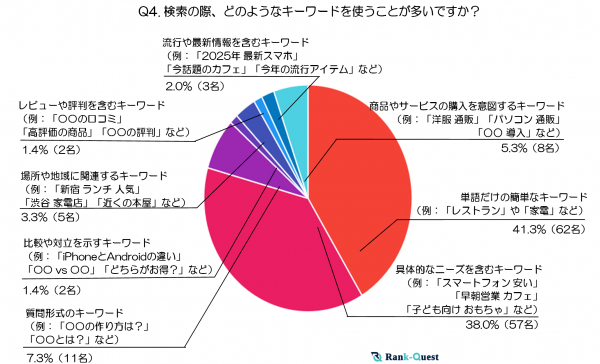 一方、「質問形式のキーワード」は7.3%で、多くはないものの、DIYやレシピ等、日常の疑問解決など、具体的に答えを得たいニーズが一定数存在します。