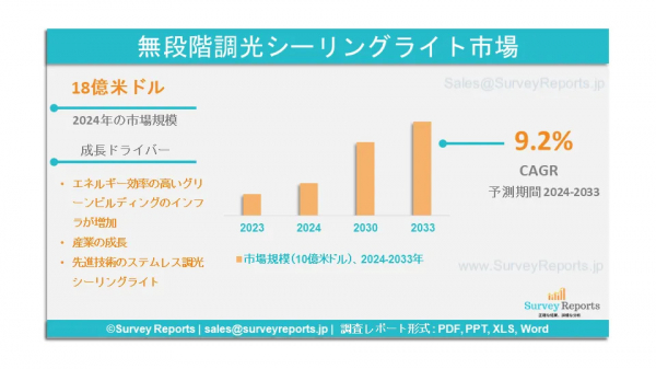 サーベイレポート合同会社は、無段階調光シーリングライト市場の予測評価を提供する2025年1月発行の調査レポート「無段階調光シーリングライト市場のタイプ別(10W未満、10〜50W)、用途別(アパート、職場)セグメント - 世界市場分析、動向、機会、予測、2024〜2033年」を発表しました。この調査レポートは、無段階調光シーリングライト市場の予測評価を提供し、成長促進要因、市場機会、課題、脅威など、いくつかの主要な市場ダイナミクスを明らかにしています。