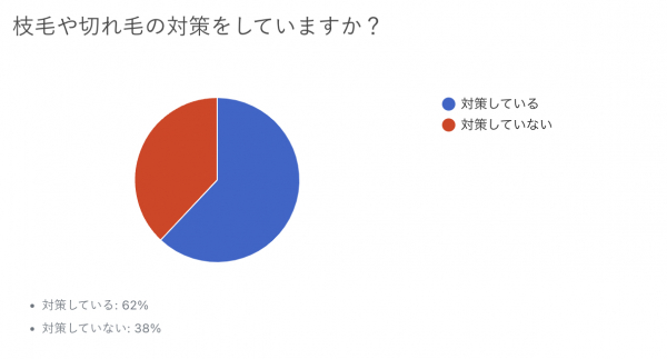また「枝毛や切れ毛の対策をしていますか?」の回答は、“対策している”が62%、“対策していない”が38%となりました。