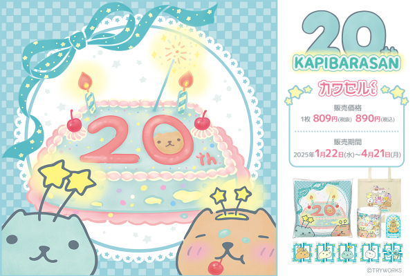 大人気キャラクター「カピバラさん」の20周年のイラストを使用した記念すべき最新のくじが、フィジカルグッズのオンラインくじ「カワセルくじ」に新登場です。