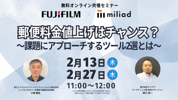 CEO:樋口 清政)は、2025年2月13日(木)/2月27日(木) AM11:00から、印刷業界向けに 郵便料金値上げはチャンス?〜課題にアプローチするツール2選とは〜と題して、富士フイルムグラフィックソリューションズ株式会社(本社:東京都港区、代表取締役社長:山田 周一郎)との共催セミナーを開催することをお知らせいたします。