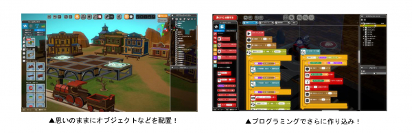 さらに、プログラミングを組み込むことでより細やかな設定を盛り込んだプレイパークを作り込み可能。思い描いたゲーム作りを叶えるだけでなく、遊びを通じて自然とプログラミングの学習にも繋がります。
