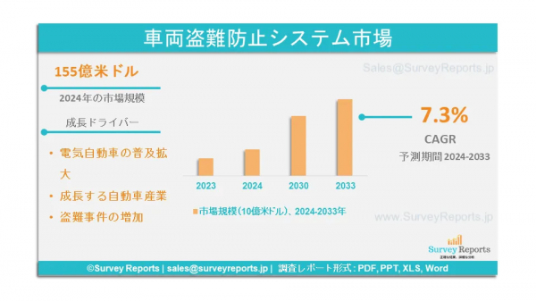 サーベイレポート合同会社は、自動車盗難防止システム市場の予測評価を提供する2025年1月発行の調査レポート「自動車盗難防止システム市場:製品別、車両タイプ別(乗用車、商用車)、製品別(ステアリングロック、アラーム、生体認証捕捉装置、イモビライザー、リモートキーレスエントリー、セントラルロック)-世界市場分析、動向、機会、予測、2024-2033年」を発表しました。車両盗難防止システム市場の成長促進要因、市場機会、課題、脅威など、いくつかの主要な市場ダイナミクスを紹介しています。