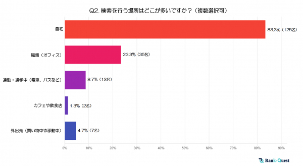 最も多かった回答は「自宅」で、83.3%と圧倒的な結果となりました。仕事や家事などで忙しい40代が、夜間やスキマ時間に自宅で落ち着いて情報を検索する様子がうかがえます。
