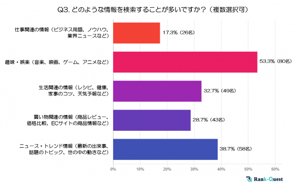 一方、「仕事関連の情報(ビジネス用語、ノウハウ、業界ニュースなど)」は17.3%にとどまり、娯楽や生活、時事と比べると割合が低めの結果となりました。