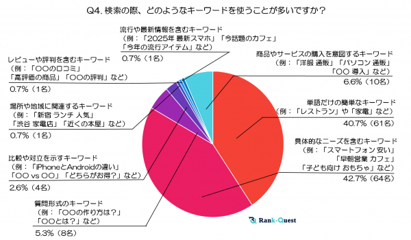 最も回答が多かったのは「具体的なニーズを含むキーワード」で、42.7%という結果となりました。家族や趣味など、ライフステージに合わせて情報をピンポイントで探すニーズの高さがうかがえます。