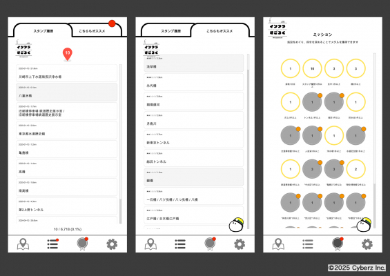 また、訪問した施設へのチェックイン履歴をもとにオススメ施設を表示し訪問を促すことで、見学体験・知識の点を線として結び、面に広げ、インフラ同士を結んだストーリーをすごろくをめぐるようにめぐります。