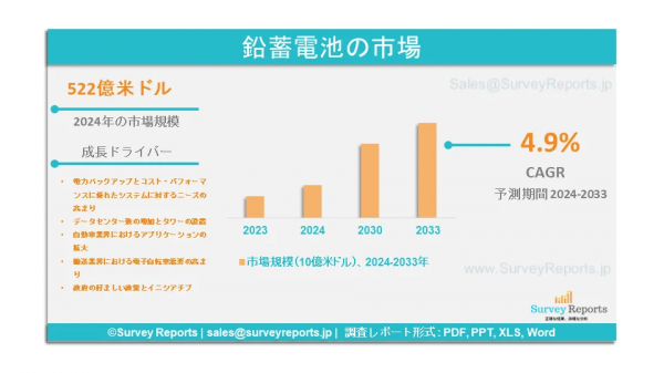 サーベイレポート合同会社は、鉛蓄電池市場の予測評価を提供する2025年1月発行の調査レポート「鉛蓄電池市場は製品別(SLI、定置式、動力式)、工法別(フラッド式、VRLA)、用途別(自動車、UPS、電気通信、電動バイク、輸送車両、その他)に区分される - 鉛蓄電池市場の世界市場分析、動向、機会、予測、2024-2033年」を発表しました。鉛蓄電池市場の成長促進要因、市場機会、課題、脅威など、いくつかの主要な市場ダイナミクスを紹介しています。